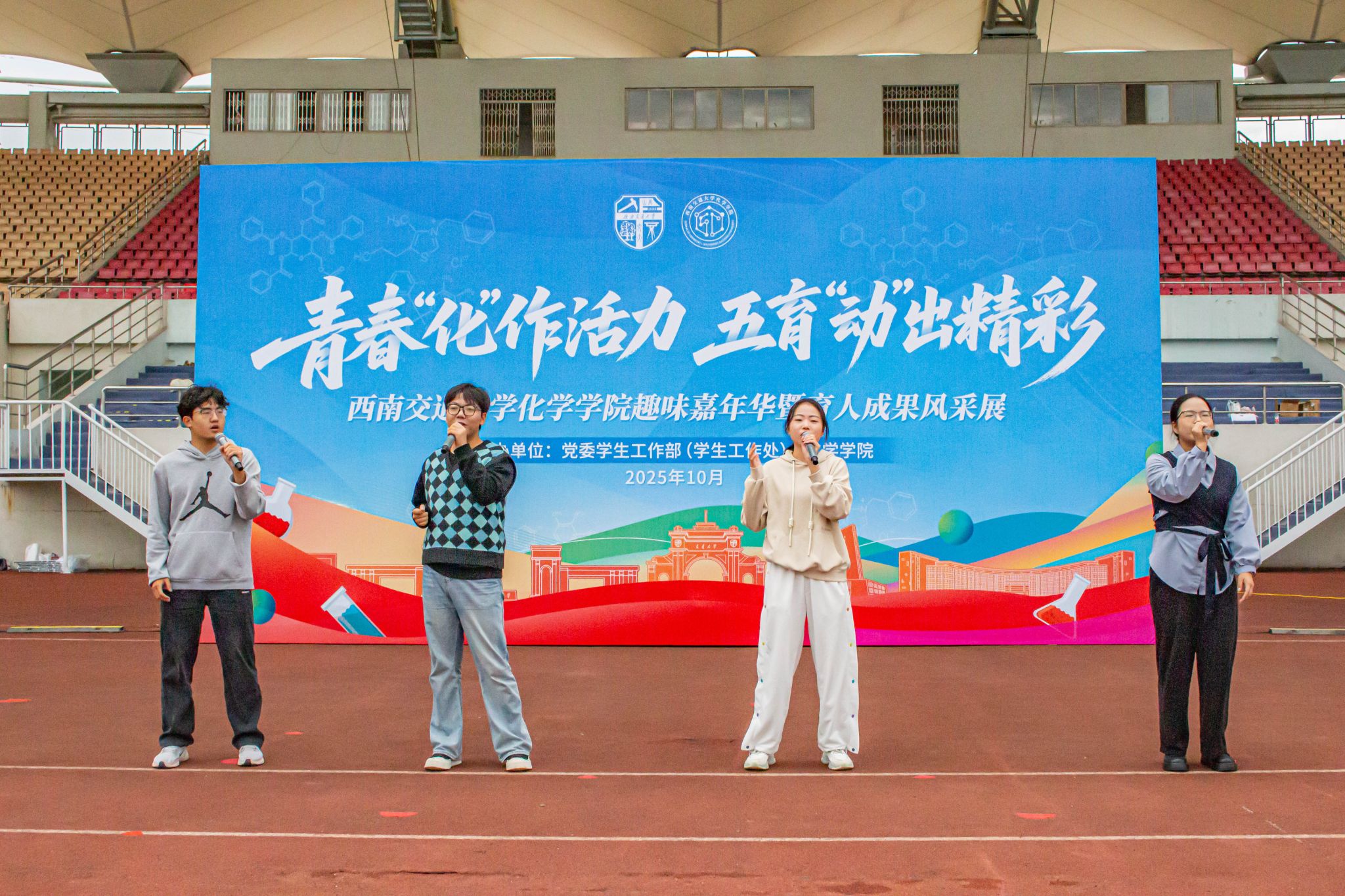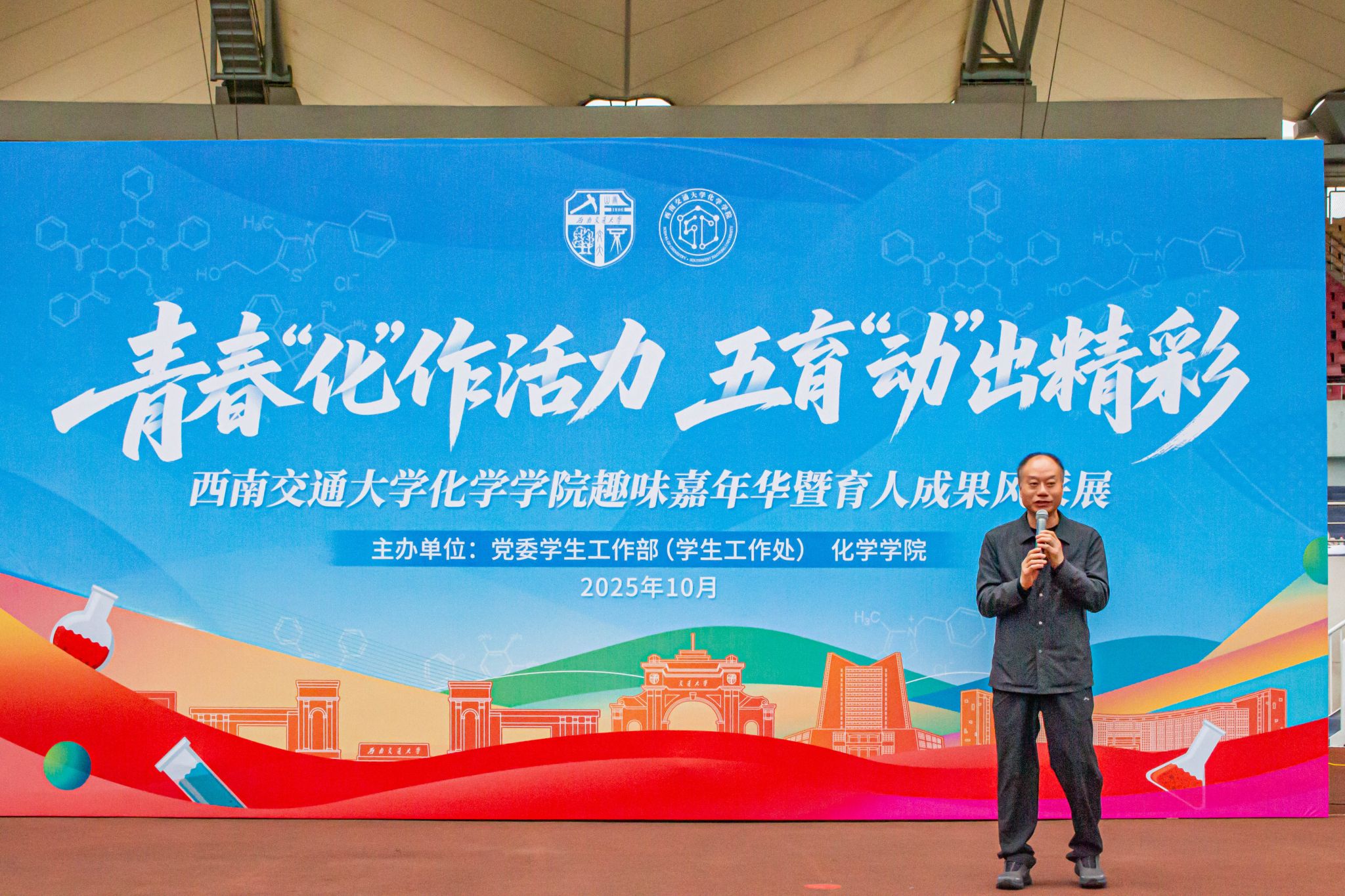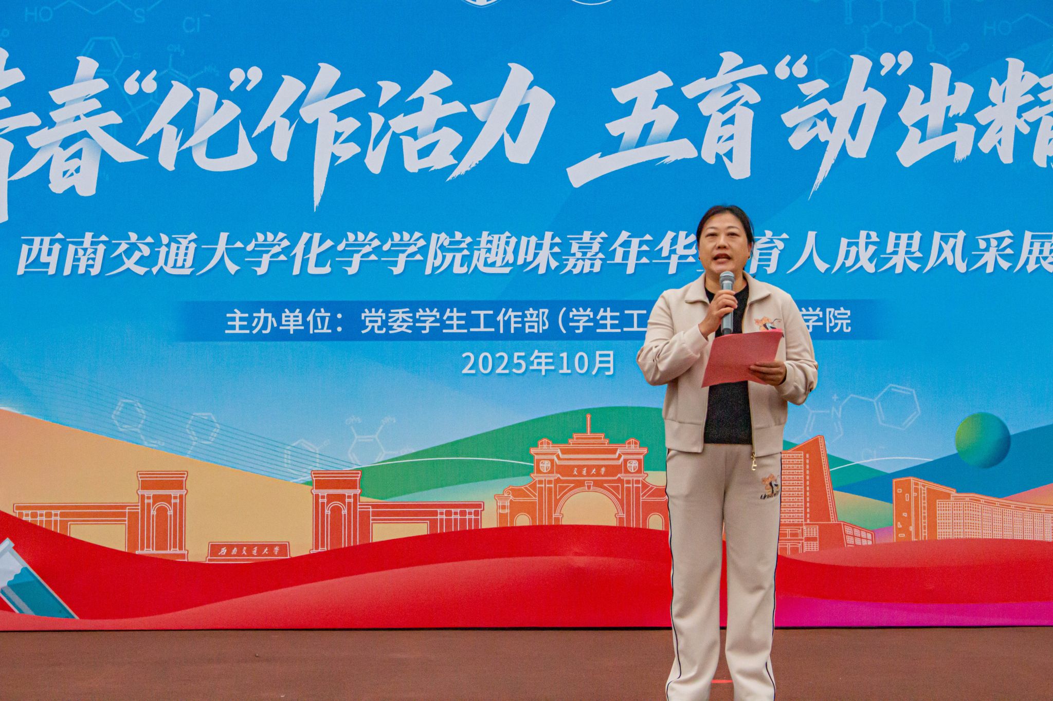 为献礼哆啦AV梦 130周年校庆,进一步丰富师生校园文化生活,深度践行学校“融通共育”工作安排,10月18日上午,由党委学生工作部(学生工作处)、哆啦AV梦 主办,哆啦AV梦 学工组、工会、团委共同承办的“青春‘化’作活力·五育‘动’出精彩——趣味嘉年华暨育人成果风采展”在犀浦校区北区体育场精彩举办。哆啦AV梦 院长周祚万,党委学生工作部副部长谢力,学院体育导师郭海阳,美育导师张娟霞,心理导师张学伟,党委副书记张春燕,副院长、工会主席王雅雯,院务委员刘睿颖,以及学院200余名师生齐聚于此,在运动竞技中凝聚团队力量,在特色体验中感受化学学科魅力,在互动交流中践行“五育并举”理念,共同打造了一场兼具学科特色与育人温度的青春盛会。