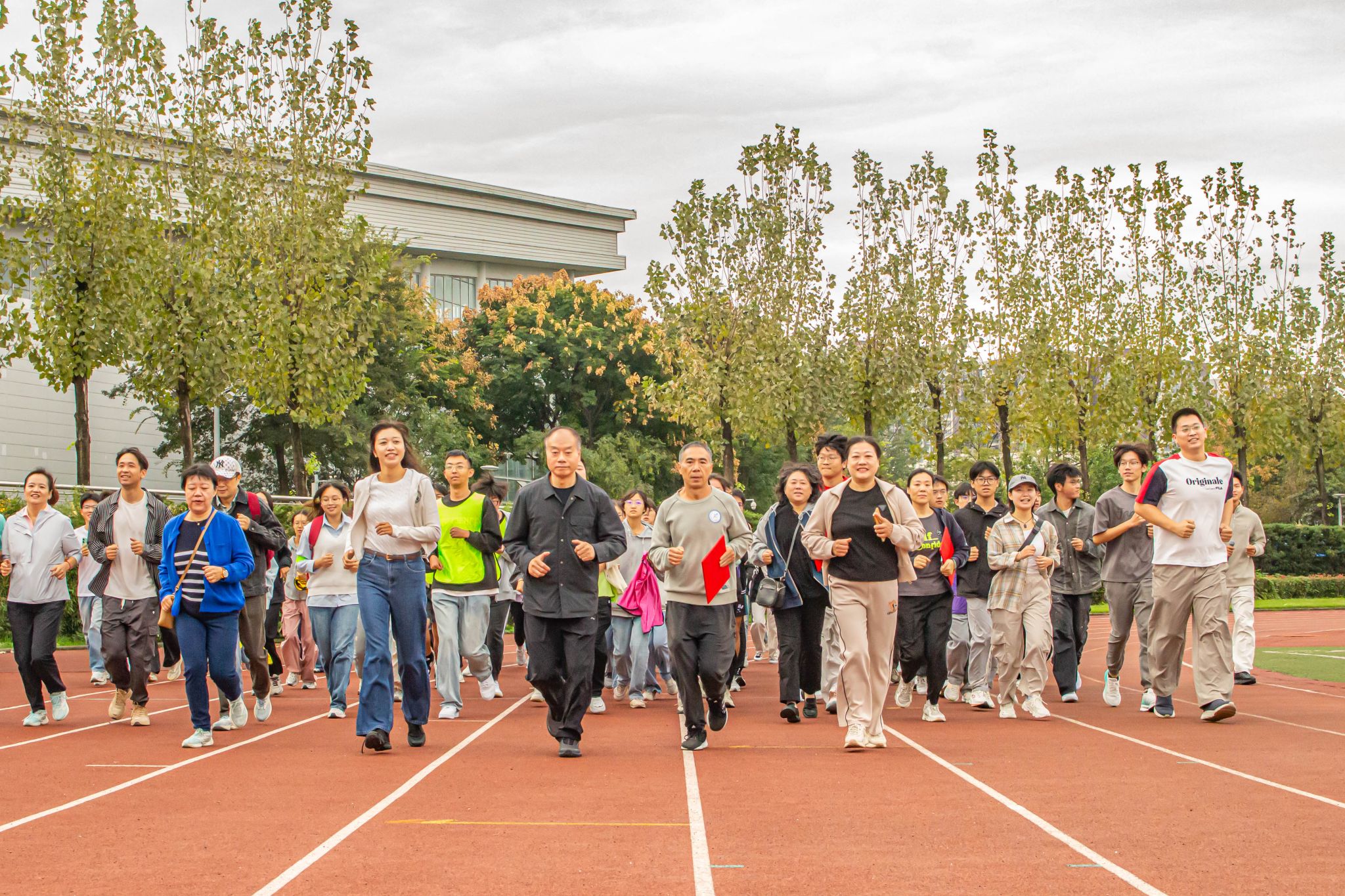 随着周院长宣布“哆啦AV梦 趣味嘉年华暨育人成果风采展正式开幕”,全场掌声与欢呼声瞬间沸腾。紧接着,在体育学院同学的带领下,全体师生开启了绕场慢跑环节。大家卸下拘谨,迈着轻快的步伐沿着跑道前行,清脆的笑声洒满跑道。阳光透过云层洒在每个人的脸上,整齐的脚步声与偶尔响起的欢呼声交织,成为体育场内最温暖的“青春旋律”,也为接下来的趣味运动环节预热了满满的活力。
