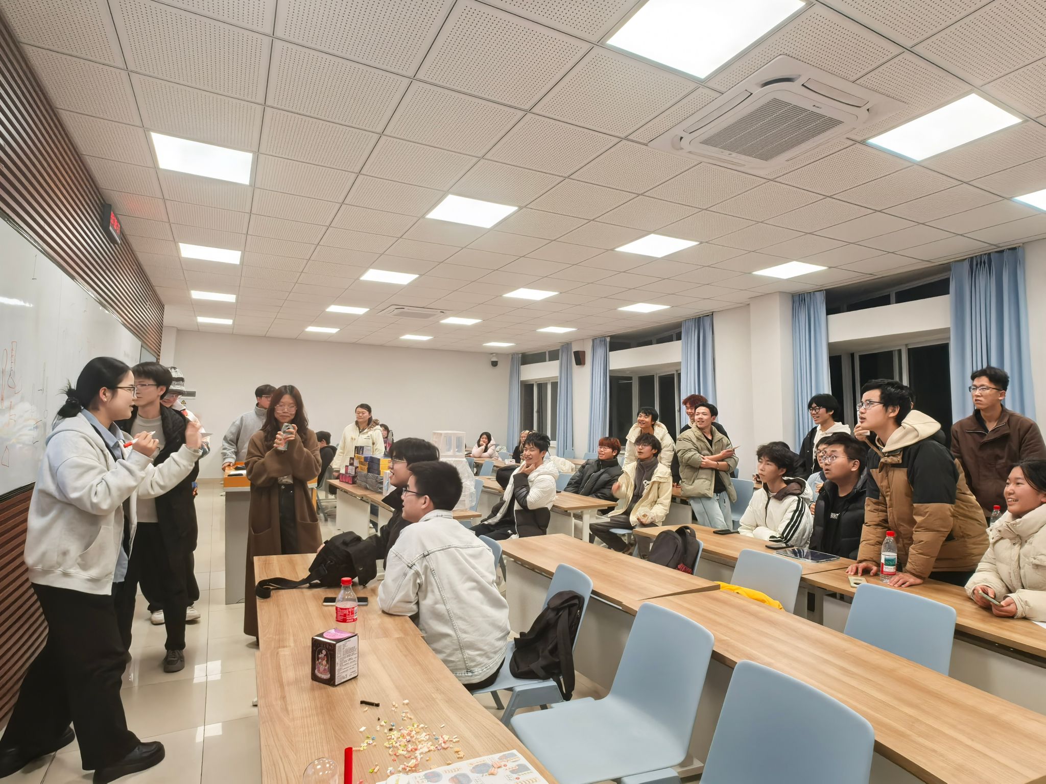化学创意“你画我猜”让抽象知识变得直观生动。题目涵盖化学仪器、物质特性、反应现象等内容,各组选派的两名同学通过简笔画、示意图创意呈现核心特征,其余组员争分夺秒抢答,在默契配合中激发创新表达,让原本晦涩的专业概念在画笔与笑声中深入人心。