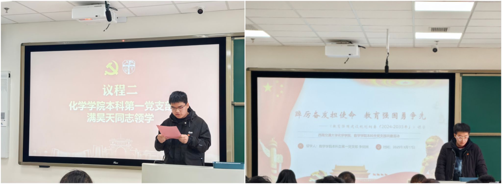 本科第一党支部的满昊天同志领学了《教育强国建设规划纲要(2024—2035年)》(以下称《纲要》),将《纲要》比作行军图,表明了深耕专业领域、担当青年使命的决心;数学学院本科生第一党支部的李倪洲同志以“踔厉奋发担使命·教育强国勇争先”为主题进行领学,勉励党员同志要在思想上、能力上、行动上发挥先锋模范作用,为强国建设、民族复兴贡献力量!