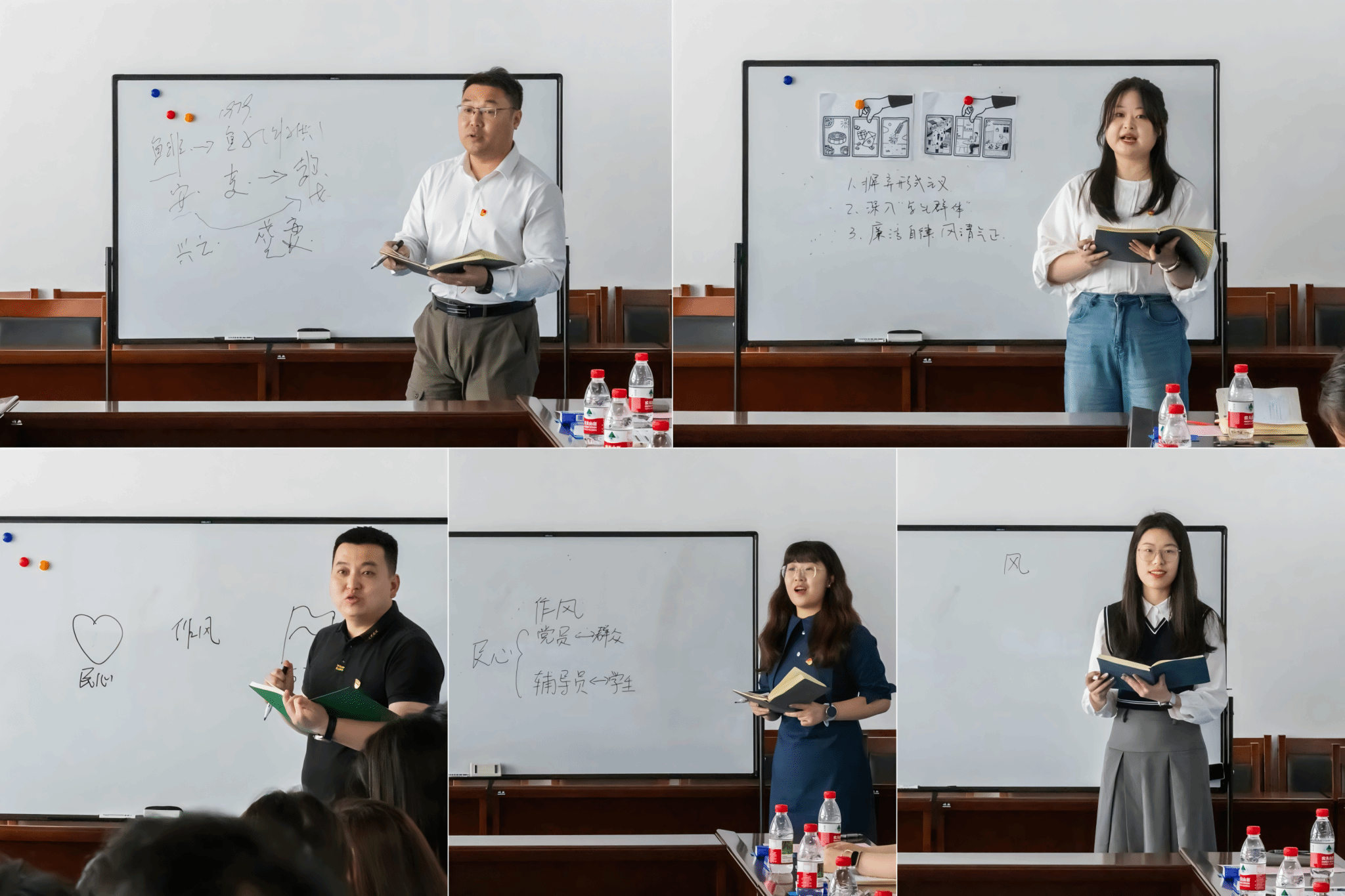 来自五个学院的辅导员分别走上“擂台”,分享学习中央八项规定及其实施细则和《习近平关于加强党的作风建设论述摘编》第一专题的心得体会。在场的辅导员们也分享了学习体会,全体与会人员对五位辅导员的表现进行了评分。