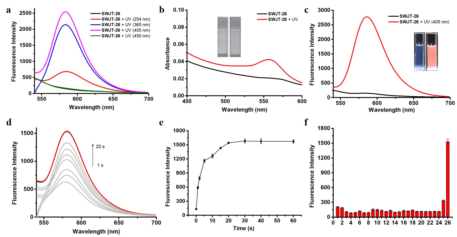 在这项工作中,作者通过逐步设计策略合成了一系列以罗丹明B为荧光基团的光激活荧光探针,并筛选出最合适的探针(SWJT-26)。研究表明,该探针可以在405 nm的蓝紫光照射下发生开环并产生红色荧光。值得注意的是,整个反应从开始到结束仅需要不到20秒,是目前反应最快速的小分子光激活探针。此外,该探针还具有极高的专一性和光学性质。为了拓展应用,作者通过合理修饰提高了探针的脂溶性,从而使其可以靶向于内质网。基于这些特点,SWJT-26实现了对细胞和裸鼠中内质网的时间控制成像。