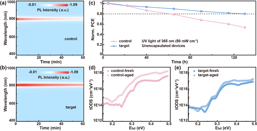该团队提出一种创新的双锚定分子桥接策略,利用天然无毒、生物相容且耐高温和紫外辐射的氨基酸衍生物Ectoine(Ec)协同减轻SnO2/钙钛矿界面缺陷和残余应力。实验研究结合基于第一性原理的密度泛函理论计算表明,羧基优先钝化SnO2中未配位的Sn4+缺陷和氧空位,而亚胺基与Pb2⁺建立了稳定的配位,钝化未配位的缺陷。双锚定分子桥接机制有助于残余应力释放,从而平滑晶界沟槽,可显著抑制非辐射复合。进一步研究显示,经Ec修饰的PSC实现了24.68%的光电转换效率(PCE)(对照组22.56%)。含有Ec的未封装PSC显示出更高的紫外线环境稳定性,在365 nm紫外线照射(50 mW cm-2)下130小时(相当于1412小时的太阳照射)后,仍能保留80.12%的初始PCE。