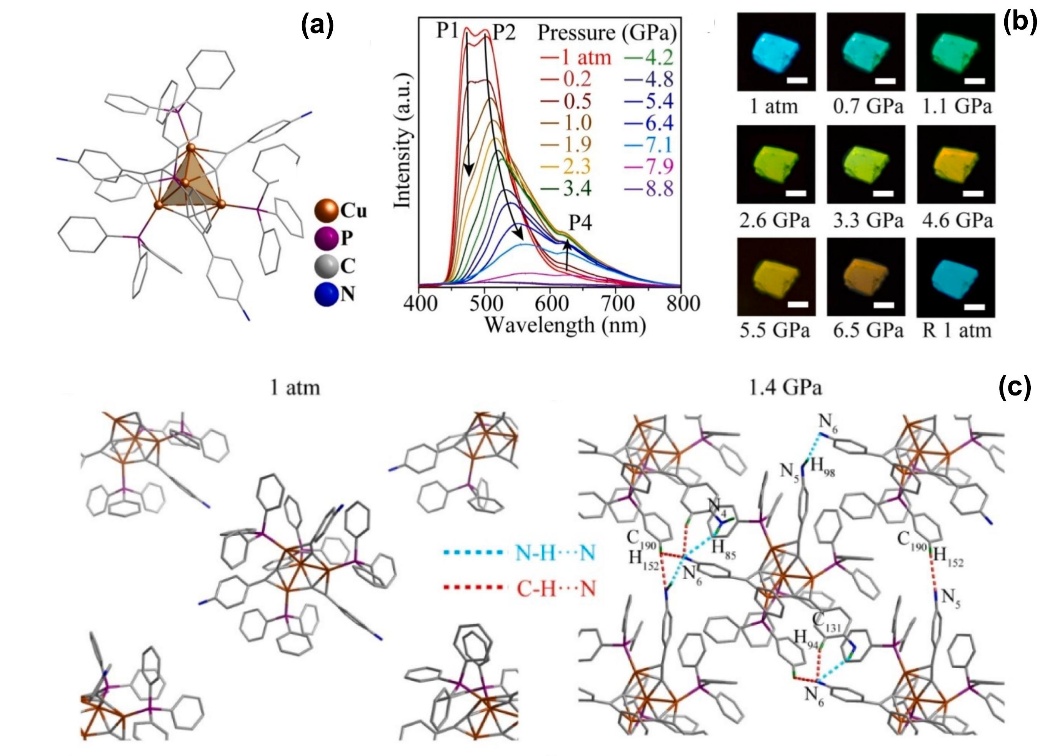 图5. 外界压力引起Cu₄ 团簇的荧光变化,其中簇间超分子作用的变化是关键因素。