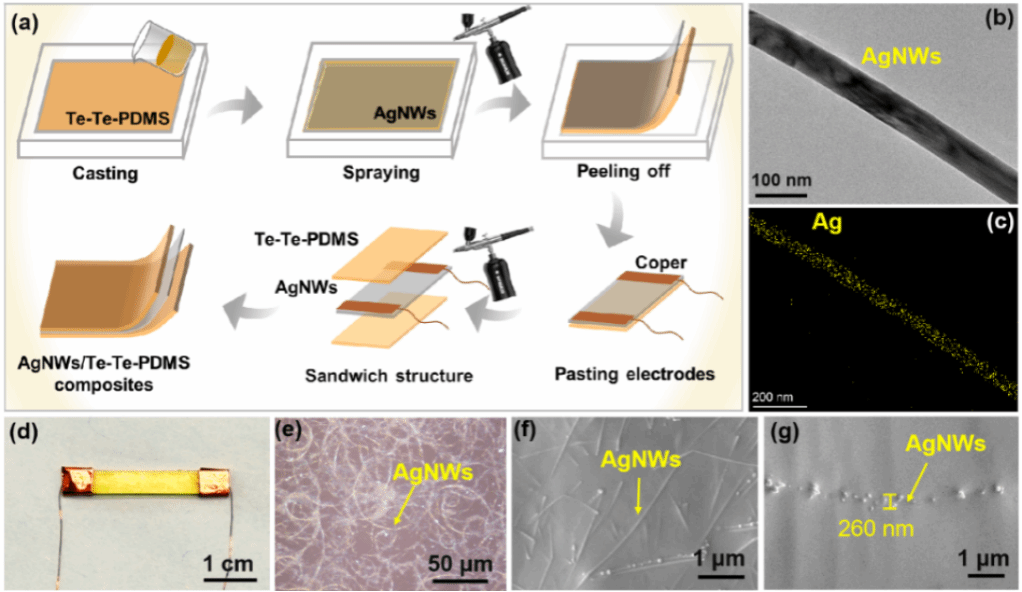 图5. AgNWs/Te‒Te‒PDMS复合材料的制备及结构表征。(a)AgNWs/Te‒Te‒PDMS复合材料的制备工艺流程示意图。(b, c)AgNWs的形貌:(b)TEM图像,(c)EDS元素分布图。(d)传感器件的数码照片。(e–g)AgNWs/Te‒Te‒PDMS复合材料的微观结构:(e)光学显微镜下显示的AgNWs逾渗导电网络,(f)复合材料表面的SEM图,(g)截面SEM图像显示导电层厚度。