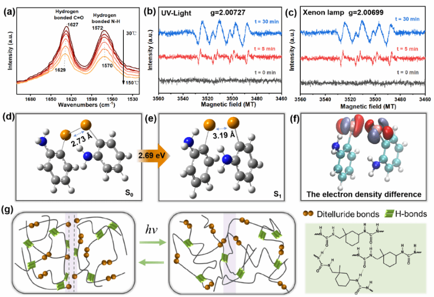 图4. Te‒Te‒PDMS弹性体自修复机理分析。(a)在25–150°C范围内Te‒Te‒PDMS弹性体的FT-IR谱图。在(b)紫外光(365 nm)和(c)可见光(氙灯)照射下的原位电子顺磁共振(EPR)谱图。(d, e)密度泛函理论(DFT)计算NH₂–Te–Te–NH₂从S₀→S₁跃迁对应的结构演变和所需能量:(d)基态(S₀)NH₂–Te–Te–NH₂的构象,(e)激发态(S₁)NH₂–Te–Te–NH₂的构象,Te–Te键长从2.85 Å延伸至3.12 Å,激发能为2.69 eV。(f)NH₂–Te–Te–NH₂分子S₀→S₁跃迁的电子密度差等值面(等值=0.005)。红色和冰蓝色区域分别对应激发后电子密度增加和减少的区域。(g)二碲键动态交换和氢键重组协同作用使Te‒Te‒PDMS弹性体自修复的机理示意图。