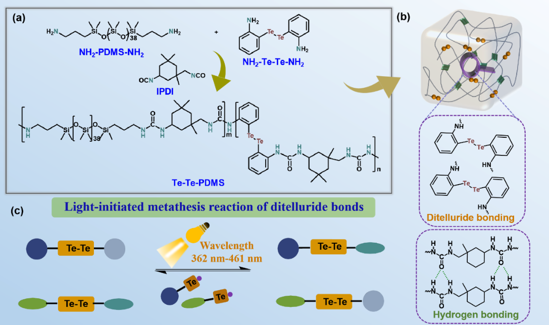 图1. Te‒Te‒PDMS弹性体的结构设计和双重动态网络结构示意图。(a)Te‒Te‒PDMS的分子结构。(b)双重动态相互作用:非共价(氢键)和共价(二碲键)相互作用。(c)在可见光照射下,二碲键的光响应行为通过二碲键的动态交换反应实现。