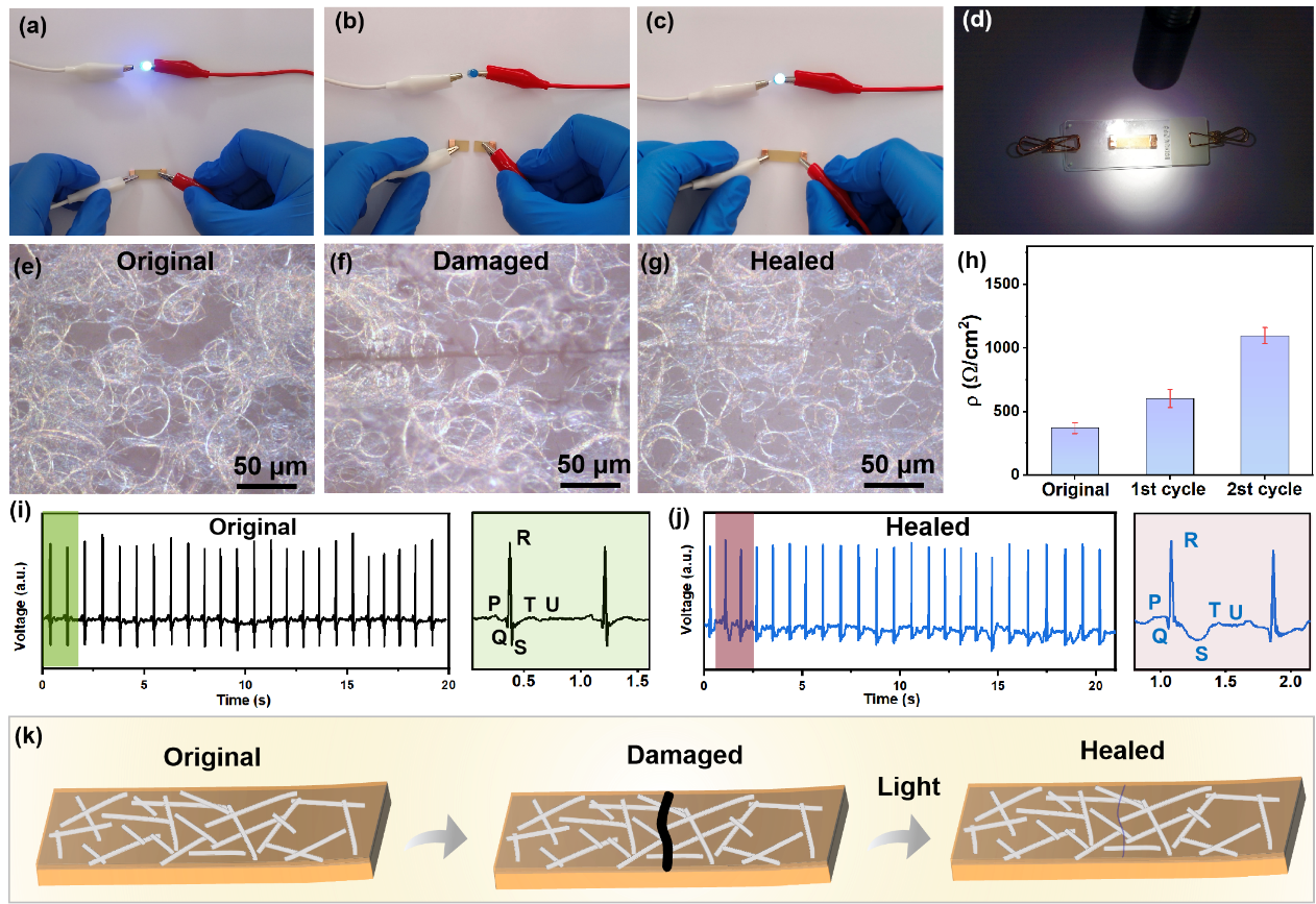 图7. AgNWs/Te‒Te‒PDMS复合材料的自修复行为。(a–c)AgNWs/Te‒Te‒PDMS复合材料修复前后连接到LED灯泡电路的数码照片。(d)氙灯照射受损导电复合材料的数码照片。(e–g)AgNWs/Te‒Te‒PDMS复合材料自修复前后的光学显微镜图像。(h)无损、首次和第二次切割-修复循环后复合材料的电阻率(ρ)。(i)无损和(j)修复后样品作为传感电极测得的ECG曲线。(k)AgNWs/Te‒Te‒PDMS复合材料电导率恢复过程的示意图。