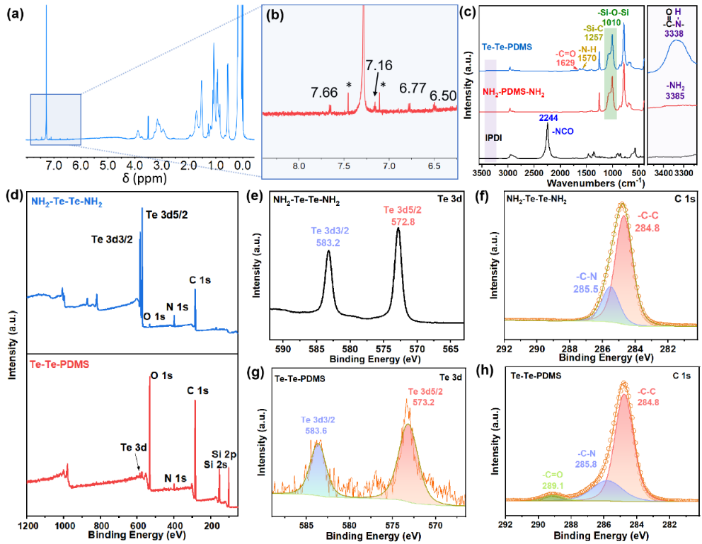 图2. Te‒Te‒PDMS弹性体的结构表征。(a)Te‒Te‒PDMS的¹H NMR谱图。(b)为(a)中标记区域的扩展谱区。(c)IPDI、NH₂–PDMS–NH₂和Te‒Te‒PDMS弹性体的FT-IR谱图。(d)NH₂–Te–Te–NH₂单体和Te‒Te‒PDMS弹性体的XPS总谱。(e–h)高分辨XPS谱图:NH₂–Te–Te–NH₂的(e)Te 3d和(f)C 1s谱图,Te‒Te‒PDMS弹性体的(g)Te 3d和(h)C 1s谱图。