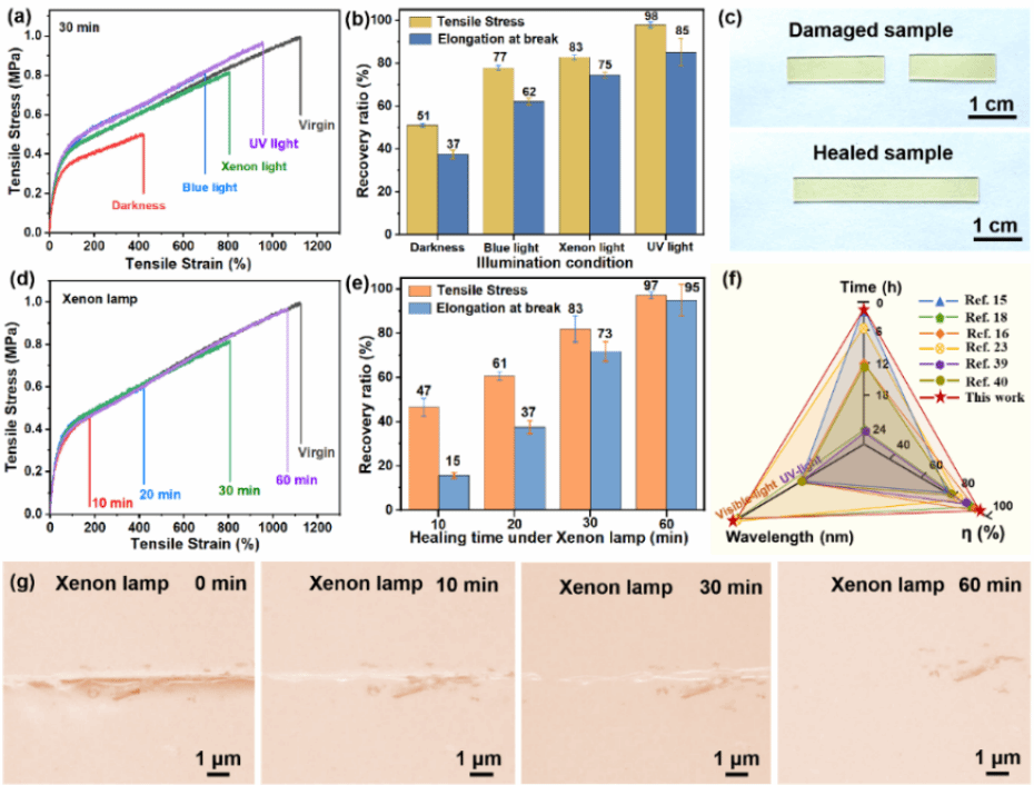 图3. Te‒Te‒PDMS(R=2:8)弹性体的光激发自修复性能。初始样品和不同波长的光源下修复30分钟后样品的(a)应力-应变曲线和(b)拉伸强度(σ)、断裂伸长率(ε)的恢复率。(c)光激发修复前后Te‒Te‒PDMS弹性体的数码照片。(d)在氙灯照射下(5 mW/cm²)力学性能恢复情况随时间的演变。(e)σ和ε恢复效率与照射时长的关系。(f)已报道的光激发自修复聚合物材料性能对比。(g)在0/10/30/60分钟间隔下的氙灯照射损伤弹性体的原位光学照片。
