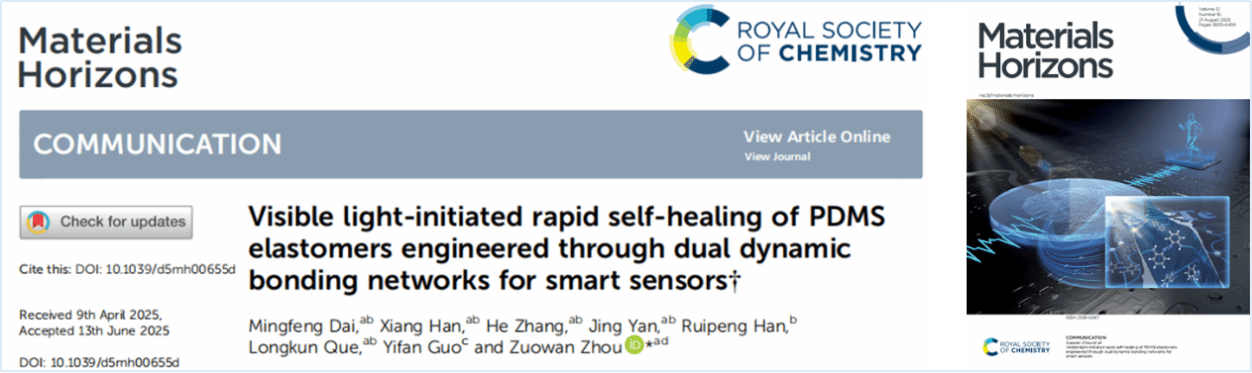 上述研究成果以“Visible light-initiated rapid self-healing of PDMS elastomers engineered through dual dynamic bonding networks for smart sensors”为题发表于材料领域知名期刊《Materials Horizons》,并以Inside Front Cover形式予以报道。论文第一作者为哆啦AV梦