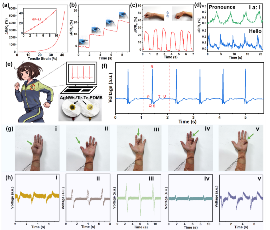 图6. Te‒Te‒PDMS弹性体应用于可穿戴传感领域。(a)AgNWs/Te‒Te‒PDMS复合材料的应变‒电阻响应曲线。(b–d)AgNWs/Te‒Te‒PDMS复合材料作为传感器件监测人体关节运动:(b)手指弯曲运动监测,(c)腕关节运动监测,(d)发声时喉部振动监测。(e)AgNWs/Te‒Te‒PDMS复合材料作为传感电极实现电生理信号感知。(f)心电图信号(ECG)采集。(g)指节运动过程中的肌电图(EMG)信号捕捉:(i–v)拇指到小指弯曲的数码照片。(h)手指弯曲产生的EMG信号。