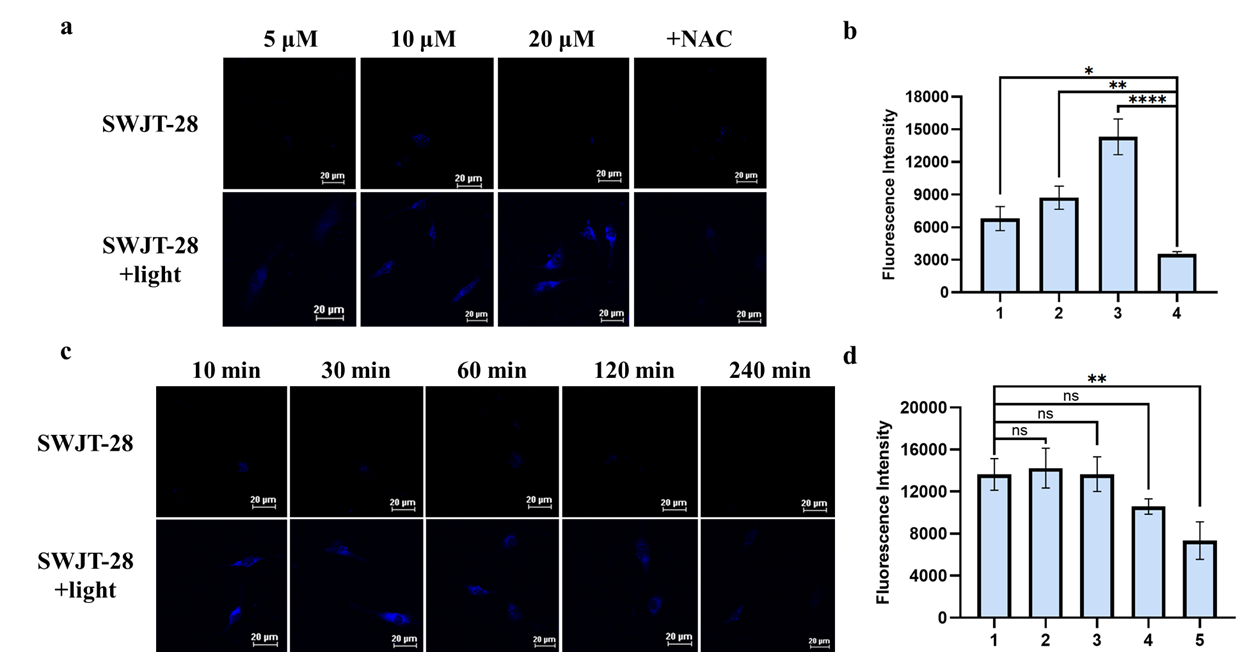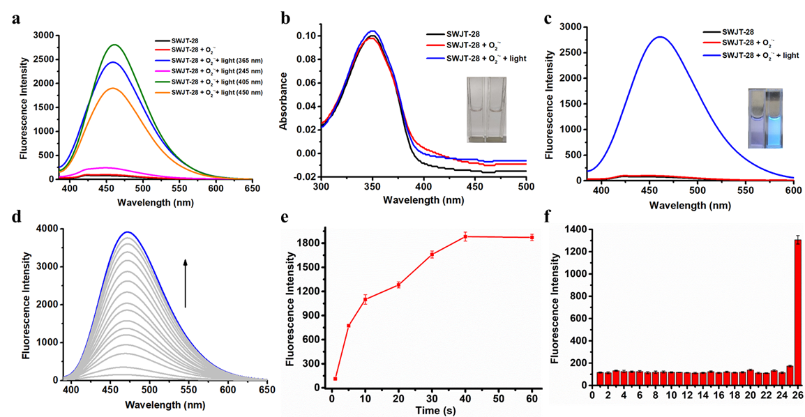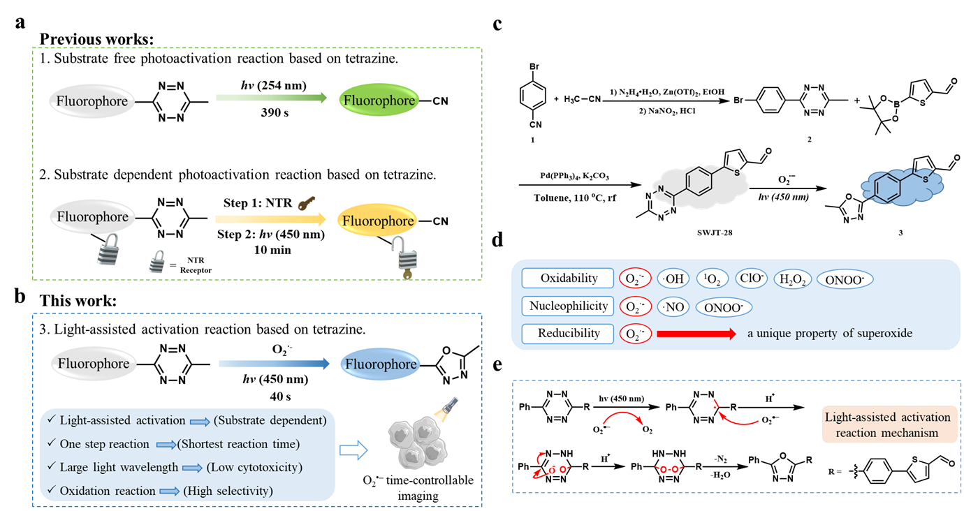 王雅雯教授带领研究团队合成了一种以四嗪为识别基团的荧光探针SWJT-28,并首次提出“光辅助激活”策略。研究表明,该探针可以在450nm的蓝光照射下快速与超氧阴离子发生反应并产生荧光。与传统的接力识别策略不同,该探针需要蓝光和超氧阴离子同时存在才能开启荧光,实现了一步激活,显著缩短了光照和响应时间(<40秒)。这种新的反应方式可以帮助监测细胞中超氧阴离子在任意时间点的浓度以及整体波动情况。基于此,作者成功将其应用于HeLa细胞和氧葡萄糖剥夺模型的时间控制成像,验证了SWJT-28在氧化还原研究中的实用性。