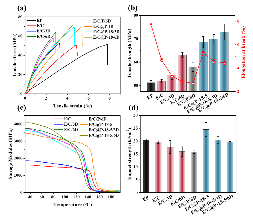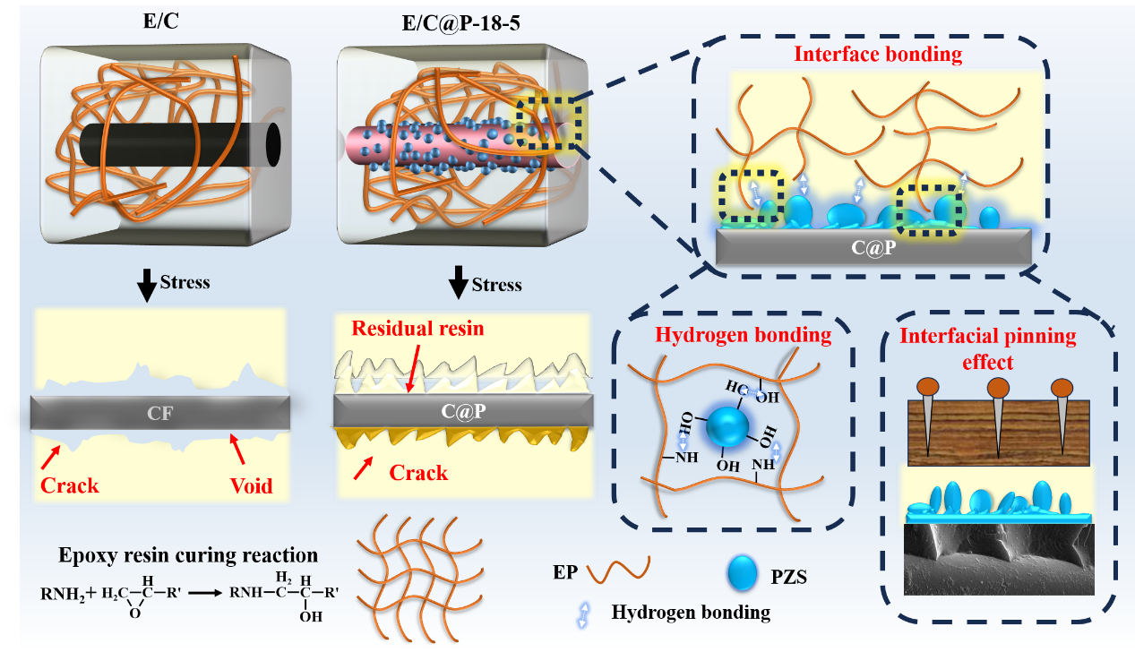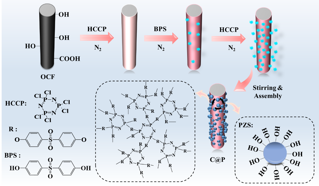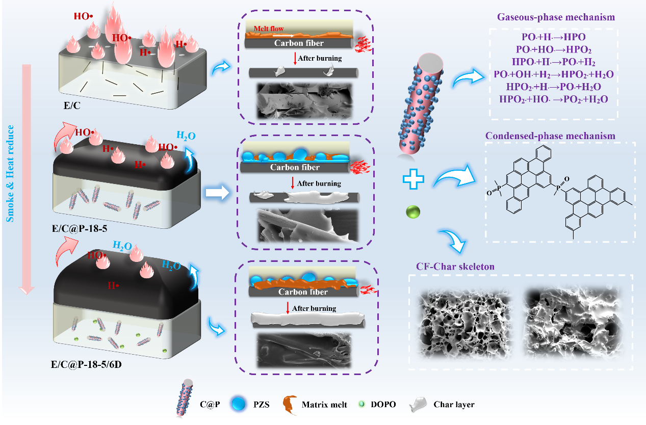 碳纤维 (CF) 增强环氧树脂(EP)复合材料(E/C)已广泛应用于众多领域,但由于CF的“烛芯”效应,它们始终受到低阻燃性的困扰。尽管添加阻燃剂的传统方法使复合材料能够获得一定的阻燃能力,但它会损害复合材料的机械性能。因此,亟需开发一种兼具优异阻燃性能和机械性能的复合材料。