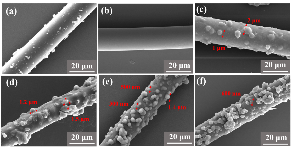 图2.(a)原始碳纤维(CF)、(b)氧化碳纤维(OCF)、(c)C@P-7-5、(d)C@P-11-5、(e)C@P-18-5 和(f)C@P-23-5 的SEM图像。