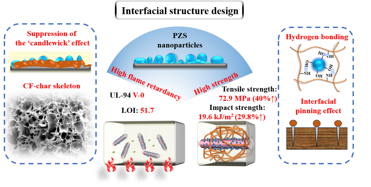 本工作提出了一种界面结构设计方法,具体而言,在CF表面原位合成聚磷腈(PZS)纳米颗粒,以同步提高E/C复合材料的阻燃性和力学性能。通过在环氧树脂基体中掺入少量 9,10-二氢-9-氧代-10-磷菲-10-氧化物(DOPO),复合材料的极限氧指数(LOI)为51.7,符合 UL-94 测试中的V-0等级。此外,与空白E/C复合材料相比,峰值热释放率(PHRR)降低了51.1%,总热释放(THR)降低了36.3%。此外,复合材料的拉伸强度提高到72.9 MPa,提高率为40.7%。其机制主要归因于界面分布的PZS纳米颗粒抑制的“烛芯”效应、组分之间的强氢键相互作用以及粗糙CF表面的界面固定效应。这项工作证实了界面结构设计的重要作用,适当的界面结构可以赋予E/C复合材料良好的综合性能。