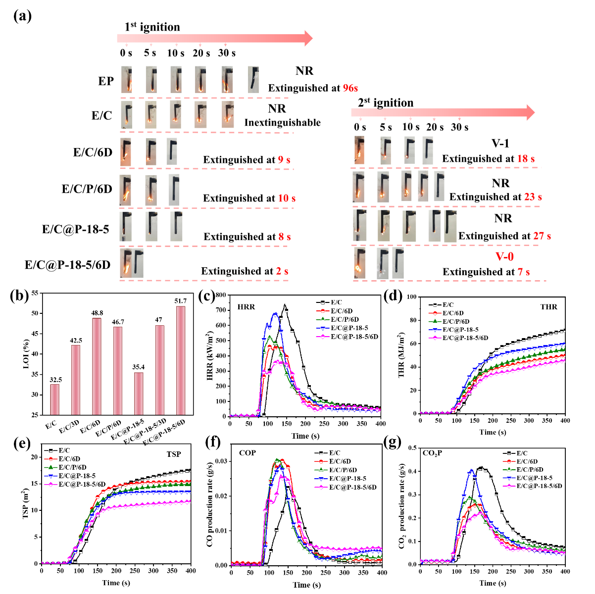 图3.(a)数码照片显示了UL-94测试中不同样品的燃烧行为;(b)不同样品的氧指数(LOI)比较;(c)热释放速率(HRR)曲线,(d)总热释放(THR)曲线,(e)总烟雾释放(TSP)曲线,(f)一氧化碳生成速率(COP)曲线和(g)二氧化碳生成速率(CO₂P)曲线.