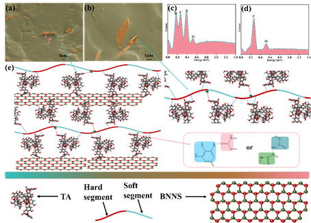 图4. (a)和(b)为SEM图像,展示了TA@BNNSs在弹性体 4 中的不同分散状态;(c)和(d)为从(a)中不同区域(1 和 2)获取的相应EDS结果;(e)弹性体中不同的相互作用的示意图。