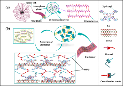 图1. 蜘蛛丝和类蜘蛛丝弹性体结构的微观结构示意图。(a)蜘蛛丝的微观结构,(b)类蜘蛛丝弹性体结构。