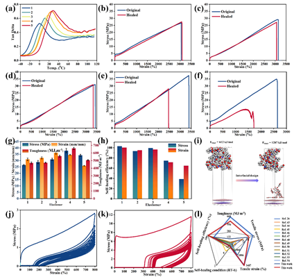 图5. (a)弹性体 1 至5的tanδ随温度的变化关系,(b-f)弹性体 1 至 5 的典型应力-应变曲线,(g)弹性体 1 至 5 的对应拉伸强度、拉伸应变和拉伸韧性,(h)弹性体 1 至 5 的自修复效率比较,(i)分子动力学模拟显示 WPU 与 TA 以及 WPU 与 TA@BNNSs 之间的结合能。(j)WPUFT 和(k)弹性体 4 样品的循环加载与恢复。(l)将我们的弹性体样品(弹性体 3 和 4)与文献中报道的其他自修复材料在室温(RT)下的断裂伸长率、极限拉伸强度、韧性、自修复效率和修复时间进行比较。