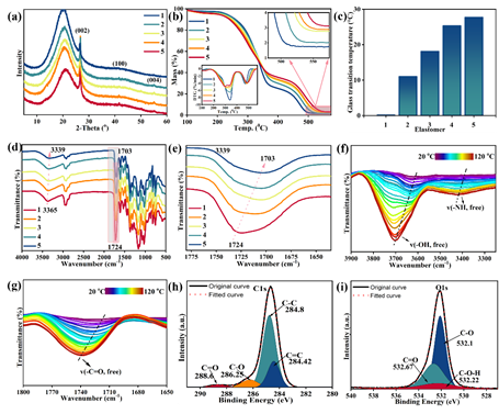 图3. (a)弹性体(1-5)的 XRD 曲线,(b)弹性体(1-5)的 TGA 曲线和 DTG 曲线,(c)通过 DMA 获得的弹性体的玻璃化转变温度(Tg),(d)弹性体(1-5)的 FTIR 光谱,(e)弹性体(1-5)在波数范围 1780 - 1640 cm-1 的 FTIR 光谱。(f)和(g)分别为代表性弹性体 4 在波数范围 3900 - 3250 cm-1 和 1800 - 1650 cm-1 的温度依赖性 FTIR 光谱。(h)和(i)分别为代表性弹性体 4 的 C 1s 和 O 1s 峰的高分辨率 XPS 光谱。