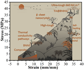 本文报道了一种利用单宁酸(TA)与氮化硼(BN)间的π-π相互作用制备出蜘蛛丝微结构中的β-片晶体的替代品TA@BNNSs复合纳米颗粒。同时为进一步增强弹性体的韧性,解决由于TA@BNNSs复合纳米颗粒尺寸过大导致的聚合物链折叠不足问题,多配位数的Fe³⁺提供的配位作用进一步提升弹性体的韧性和自愈性。通过结构设计,制备出具有蜘蛛丝结构的高强度、高韧性弹性体。这种设计使得弹性体的韧性达到660 MJ m⁻³,大约是蜘蛛超强捕食丝纤维的四倍。此外,该弹性体还展示了优异的综合性能,如高拉伸强度37.4 MPa、高断裂伸长率3433%、75%的拉伸强度和断裂伸长率的自愈效率,以及约120°C的宽阻尼温度范围。这项研究为制备高性能、高动态键密度的自愈材料提供了借鉴。