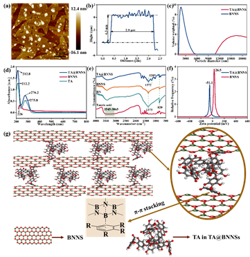 图2. (a)和(b)为BNNSs的原子力显微镜AFM图像及其对应的高径图,(c)为样品的粒度分布,(d)为紫外-可见吸收光谱,(e)为FTIR曲线,(f)为 Zeta 电位,(g)为 TA@BNNSs 组装结构的示意图。