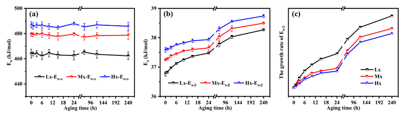 图6. 不同分子量PLLA样品其(a) α、(b) β松弛活化能随物理老化时间的变化趋势以及(c) β松弛活化能的增长速率。
