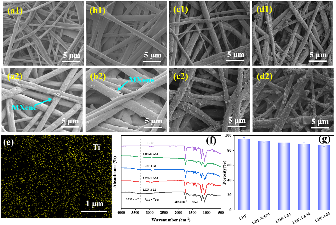 图1 仅包覆PDA的LDF-c-0和沉淀MXene的LDF-c-M纤维膜SEM图: (a1) LDF-0.5-0 (b1) LDF-1-0 (c1) LDF-1.5-0 (d1) LDF-2-0; (a2) LDF-0.5-M, (b2) LDF-1-M (c2) LDF-1.5-M and (d2) LDF-2-M. (e)钛元素的分布;(f) LDF与LDF-c-M的红外光谱图;(g)膜的孔隙率