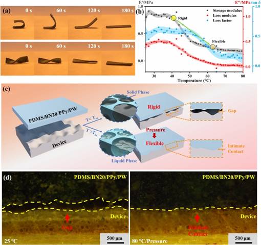 图4 (a) PDMS/BN20/PPy/PW的光驱动形状恢复行为;(b) PDMS/BN20/PPy/PW的存储模量(E')、损耗模量(E'')和损耗因子(tanδ)随温度的变化曲线;(c) PDMS/BN20/PPy/PW模量转变机理图;(d) PDMS/BN20/PPy/PW与器件界面接触的光学显微照片