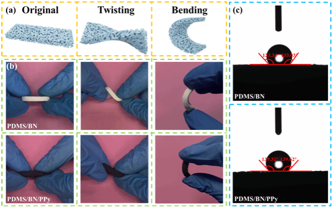 图2 (a) 复合材料在原始、扭曲和弯曲状态下的示意图;(b) PDMS/BN和PDMS/BN/PPy的原始、扭曲和弯曲状态;(c) PDMS/BN和PDMS/BN/PPy的接触角