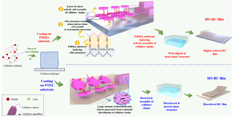 图1. 纤维素薄膜的制作过程和基底诱导的分子堆积状态示意图:包括高度有序再生纤维素薄膜(HO-RC,Ax)中 PMMA 基底诱导的纤维素大分子优先取向和无序再生纤维素薄膜(DO-RC,Ex)中 PTFE 基底诱导的无序分子堆积。