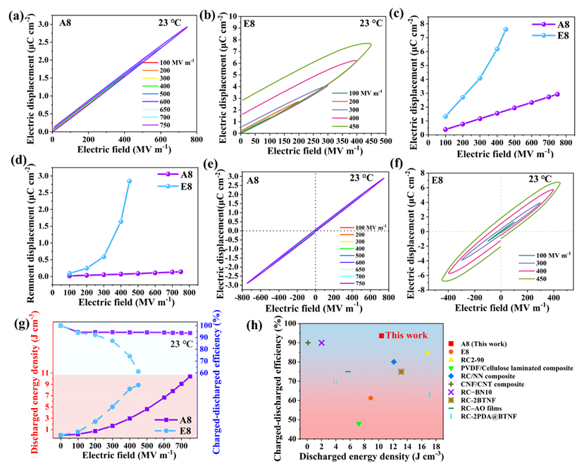 图4. 在 23 ℃ 下测量的A8和E8薄膜的储能性能:(a)和(b)分别是 A8 和 E8 薄膜的单极 D-E 环;(c)和(d)分别比较A8和E8薄膜的电位移和残余极化 ;(e)和(f)分别为 A8 和 E8 薄膜的双极 D-E 环;(g)根据单极 D-E 循环计算出的放电能量密度和电荷放电效率与电场的函数关系;(h)A8、E8 样品与文献中报道的选定纤维素电介质的储能性能比较。