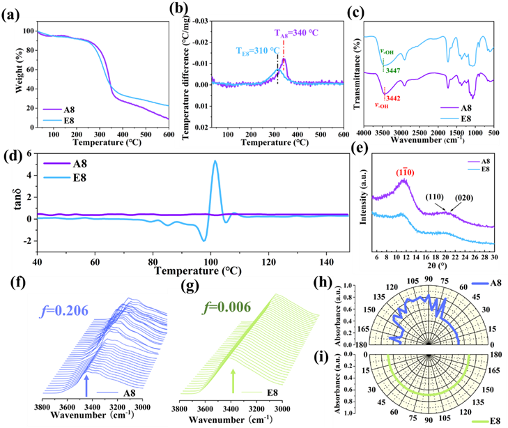 图2. 再生纤维素薄膜的结构特征如图所示:(a)A8和E8薄膜的TGA和(b)DTG曲线;(c)A8和E8薄膜的傅立叶变换红外光谱;(d)通过DMA测量获得的薄膜tanδ曲线;(e)A8和E8薄膜的WAXD曲线;(f)A8和(g)E8薄膜的偏振傅立叶变换红外光谱;(h)A8样品的3439 cm-1处和(i)E8样品的3442 cm-1处的强度变化与偏振角的函数关系分别如(f)和(g)所示。