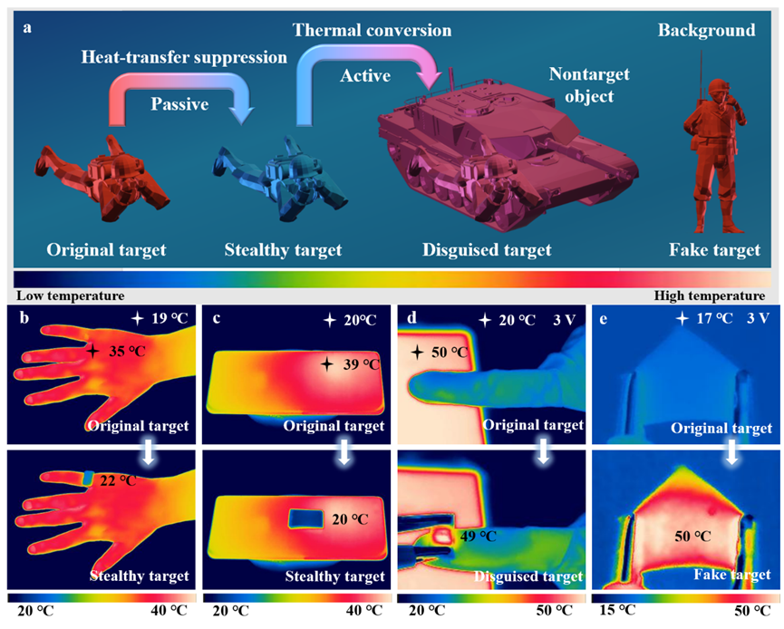 图6 MF@PPy泡沫的红外热伪装应用。a MF@PPy泡沫在不同环境条件下的主动和被动热伪装示意图。MF@PPy泡沫在b人体、c电子设备、d低温物体和e虚假目标的红外热伪装应用。