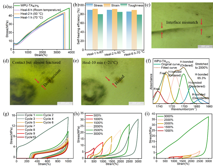 图5. (a) 不同温度下愈合后的WPU-TA47%弹性体的应力-应变曲线;(b) 对应的应力、应变和拉伸韧性的自愈效率;(c-e) WPU-TA47%弹性体的光学显微镜图像:(c) 断裂截面的界面错配,(d) 和(e) WPU-TA47%弹性体近断裂型接触愈合前后;(f) 拉伸至2000%时WPU-TA47%弹性在C=O伸缩振动区域的FT-IR光谱;(g-i) WPU-TA47%弹性的循环拉伸曲线:(g) 在恒定应变为1000%时,(h) 应变增加,(i) 应变减小。