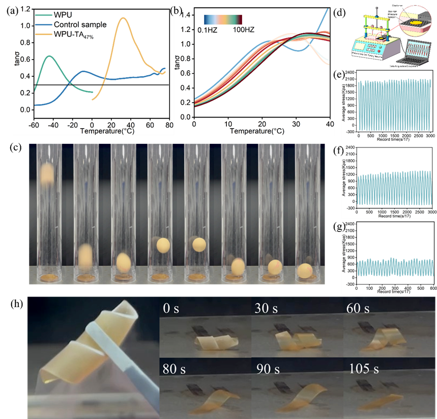 图4. (a) 弹性体在1 HZ下的tanσ与温度的关系; (a) 不同频率下获得的WPU-TA47%弹性体的tanσ与温度的关系; (c) 将WPU-TA47%弹性体用作缓冲垫以保护掉落的鸡蛋; (d) 阻尼效果测试装置的示意图; (e, f) WPU和WPU-TA47%弹性体在0.166 HZ下的阻尼响应; (g) WPU-TA47%弹性体在0.5 HZ下的阻尼响应; (h) 记录WPU-TA47%弹性体依次恢复形状的数码照片。