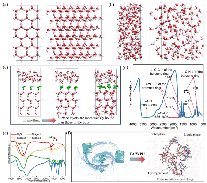 图1. (a)固体冰中有序的分子排列;(b)液态水中的随机分子排列;(C)冰融化过程的分子排列;(d)和(e) TA和冰封TA在不同融化阶段的FT-IR光谱;(f) TA与WPU界面逐步交联示意图。