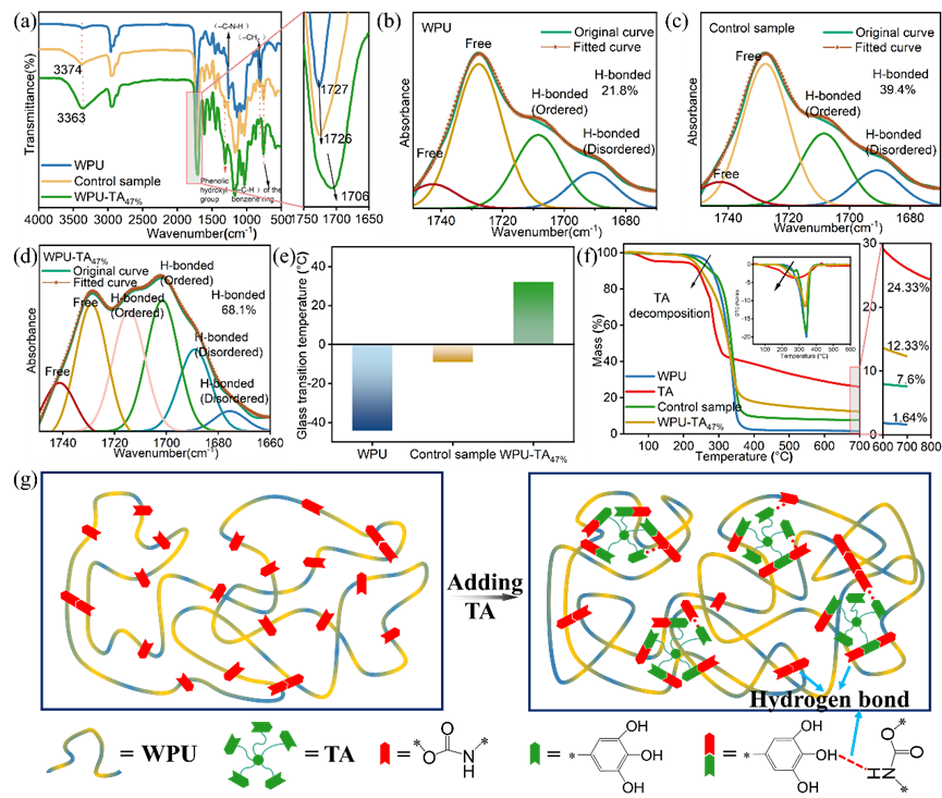 图2. (a)弹性体的FT-IR光谱;(b)、(c)、(d) WPU、对照样和WPU- TA47%在C=O拉伸振动区的FT-IR光谱;(e)通过DMA获得的弹性体的Tg;(f)弹性体TGA曲线;(e) WPU-TA弹性体装配结构示意图。