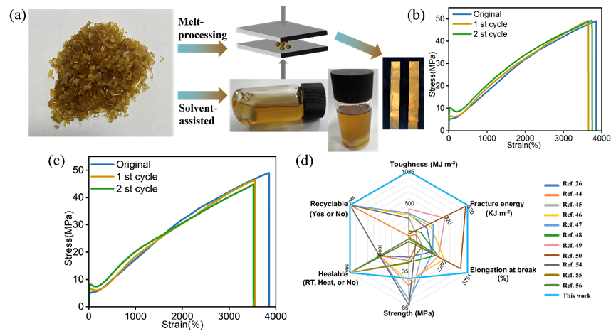 图6. (a) 采用热压技术和溶剂辅助技术对WPU-TA47%弹性体进行回收处理的过程; (b) 采用热压回收得到的WPU-TA47%弹性的应力-应变曲线; (c) 采用溶剂辅助回收技术得到的WPU-TA47%弹性的应力-应变曲线; (d) 将WPU-TA47%弹性与文献报道弹性体的机械性能、自愈合能力和可回收能力进行全面比较。