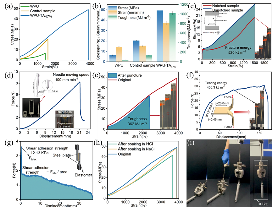 图3. (a) 弹性体的应力-应变曲线;(b) 弹性体相应的抗拉强度、断裂应变和断裂韧性; (c-g) WPU-TA47%弹性体的缺口拉伸试验曲线、穿刺试验曲线、穿刺后的拉伸试验曲线、撕裂试验曲线和搭接剪切粘接试验; (h) WPU-TA47%弹性体浸泡HCl溶液和饱和NaCl溶液7天后干燥时的应力-应变曲线; (i) WPU-TA47%弹性体能够举起相当于自身重量约30000倍重量的数码照片。