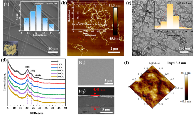 图2. 薄膜的结构表征。(a)商用芳纶纤维的SEM图像;(b)化学剥离后的AFM图像;(c)ANFs的 TEM图像;(d)薄膜的XRD曲线;(e)5 CA薄膜的表面和内部;(f)5 CA薄膜的表面粗糙度。