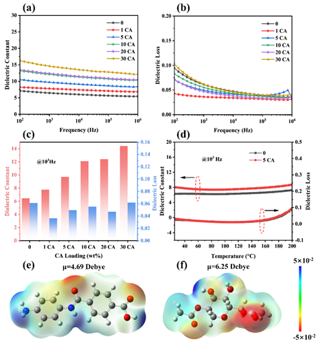 图5. 全有机芳纶薄膜的介电性能分析。(a)介电常数和(b)介电损耗;(c)介电常数和介电损耗分析;(d)ANFs薄膜和5 CA薄膜的变温介电谱;(e)ANFs和(f)CA的静电势分布。