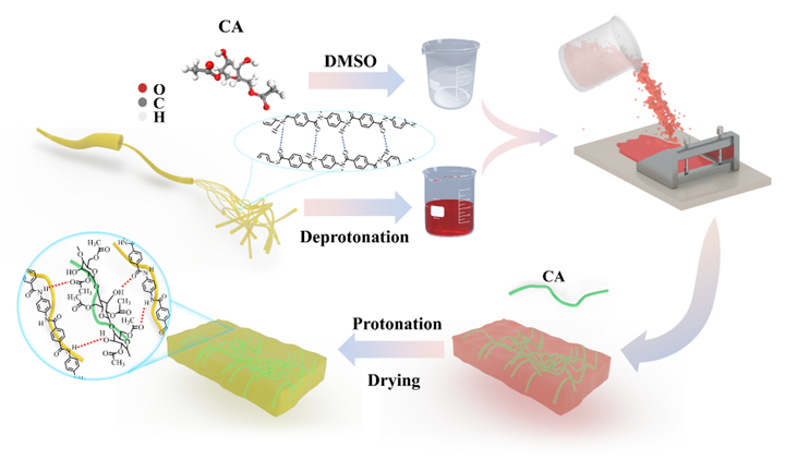 随着电子设备技术的发展,小型化和高度集成的普遍趋势导致了功率密度的显著升级。这种进展需要优越的电气绝缘材料,能够满足不断升级的性能标准。因此,必须使用能够承受极端温度和电压的电绝缘材料。芳纶纳米纤维(ANFs)是一种高性能聚合物,具有酰胺键和刚性芳香环交替连接的分子链,这使该材料具有优异的耐高温性和电绝缘性。尽管无机宽带隙填料的掺入能够改善ANFs复合薄膜的电绝缘性能,但其对电绝缘性能的改善是有限的。因此,对于制造具有增强击穿强度的ANFs薄膜仍然是一个艰巨的挑战。在这种背景下,全有机薄膜引起了研究者的极大兴趣,同时该薄膜在高温环境领域具有巨大的应用潜力。