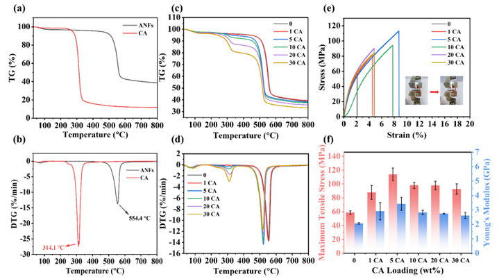 图3. 薄膜的热稳定性及力学性能分析。CA和ANFs的TGA (a)和DTG曲线(b);薄膜的TGA曲线(c)和相应的DTG曲线(d);应力-应变曲线(e)和薄膜的强度分析(f)。