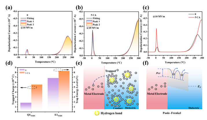 图7. (a-c)不同CA含量的全有机芳纶膜的TSDC曲线和拟合曲线;(d)捕获电荷以及薄膜捕获的深度;(e)薄膜内的电荷传导机制;(f)P-F发射。
