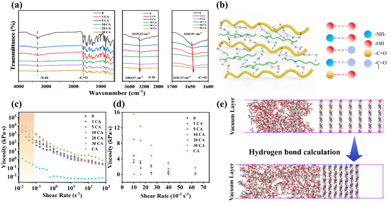 图4. 薄膜的(a) ATR-FTIR光谱和局部放大图;(b)CA和ANFs之间的氢键类型;(c)CA/ANFs溶液随CA浓度增加的粘度变化和局部放大图(d);(e)ANFs复合薄膜的分子动力学模拟分析。