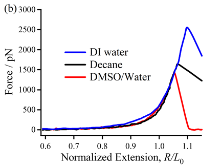 当DMSO与水以摩尔比1:2混合时,1个DMSO分子可以与2个水分子形成稳定的络合物。由于氢键的饱和性,此时水分子很难再与其他分子形成氢键。为了验证上述推论,作者研究了PMMA在DMSO/水混合溶剂(n:n = 1:2)中的单链行为。在该环境中得到的F-E曲线与癸烷中的F-E曲线可以较好地重合,而与水中的F-E曲线存在显著差异(图1b),表明图1a中曲线间的差异应归因于PMMA和水分子之间的氢键作用。