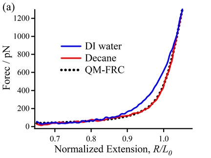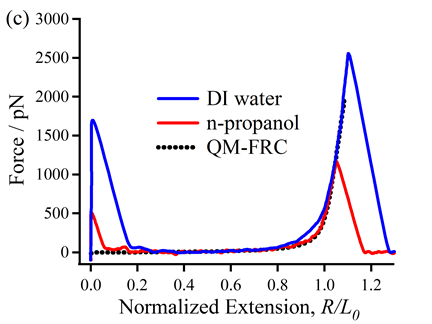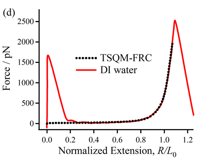 醇类溶剂由于所含有的羟基也有望与PMMA形成氢键作用。但与水分子不同,一元醇(如正丙醇)只存在1个氢键供体,只能与PMMA形成单氢键作用。PMMA在正丙醇中的F-E曲线可以与癸烷中的F-E曲线很好地重合,但不能与水中的F-E曲线重合(图1c)。这一结果表明PMMA和水分子之间的差异应归因于双氢键作用(水桥),而非单氢键作用。两态QM-FRC模型(TSQM-FRC模型)已被证实可以很好地描述高分子在水桥作用下的单链行为(Macromolecules 2019, 52, 7324-7330)。PMMA在水中的F-E曲线可以被TSQM-FRC曲线很好地拟合(图1d),进一步证明了PMMA在水环境中形成了水桥结构。