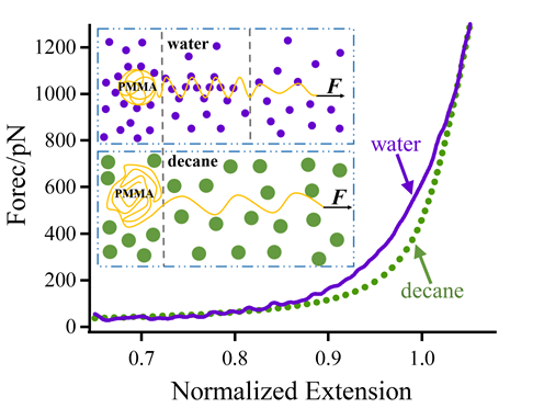 崔树勋课题组利用基于原子力显微镜的单分子力谱技术(AFM-based SMFS)研究了它们两者之间的作用机制。研究结果表明,在适当外力作用下,PMMA可以与水分子通过双氢键作用形成水桥结构,即适度拉伸有利于促进PMMA的水合作用。这一发现从单分子角度揭示了PMMA与水分子相互作用的潜在机制,有助于从自下而上的角度理解并合理调控PMMA材料的力学性质。